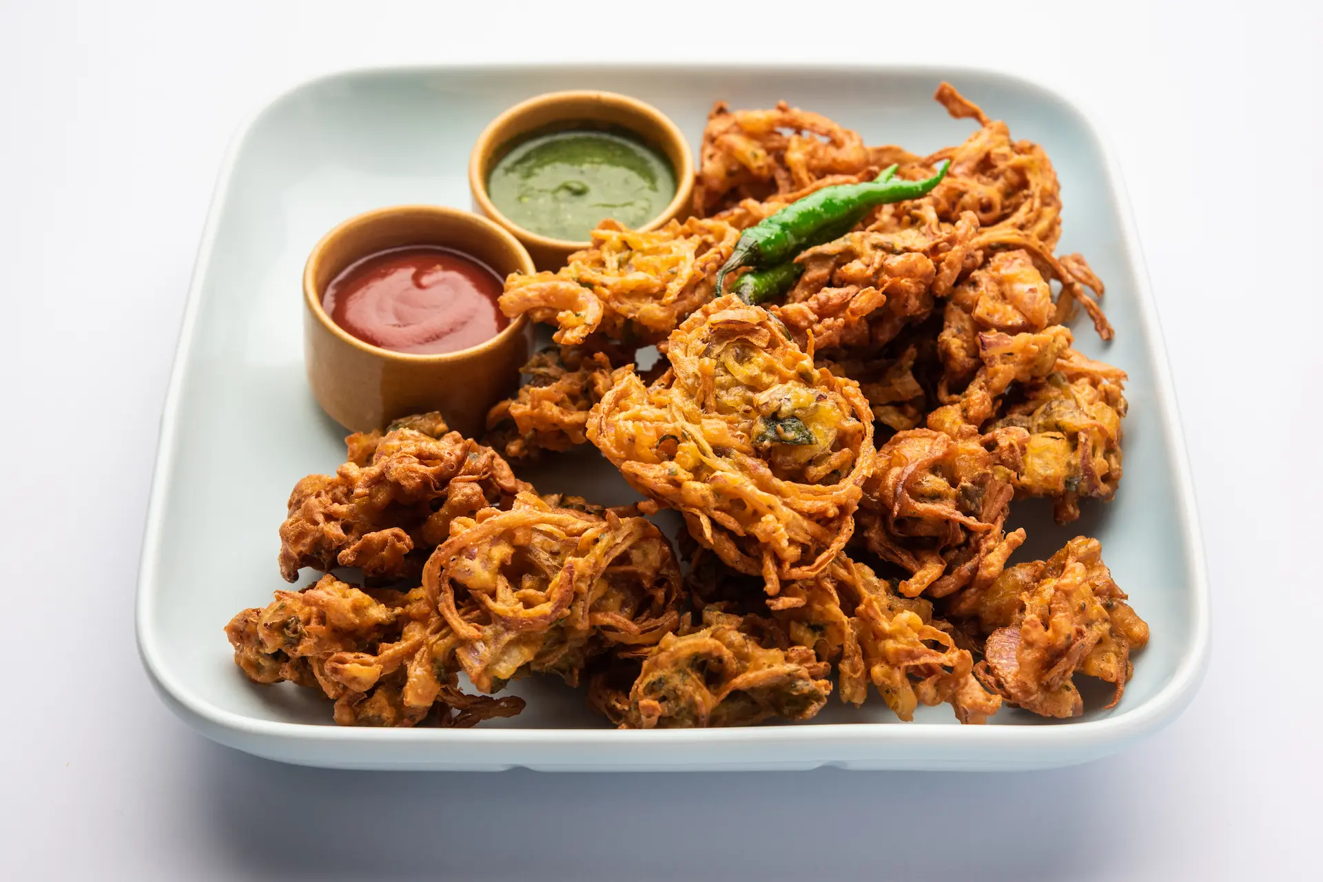 Freshly sliced onions coated in spiced gram flour batter and deep-fried to golden perfection. Served hot for a crunchy snack.